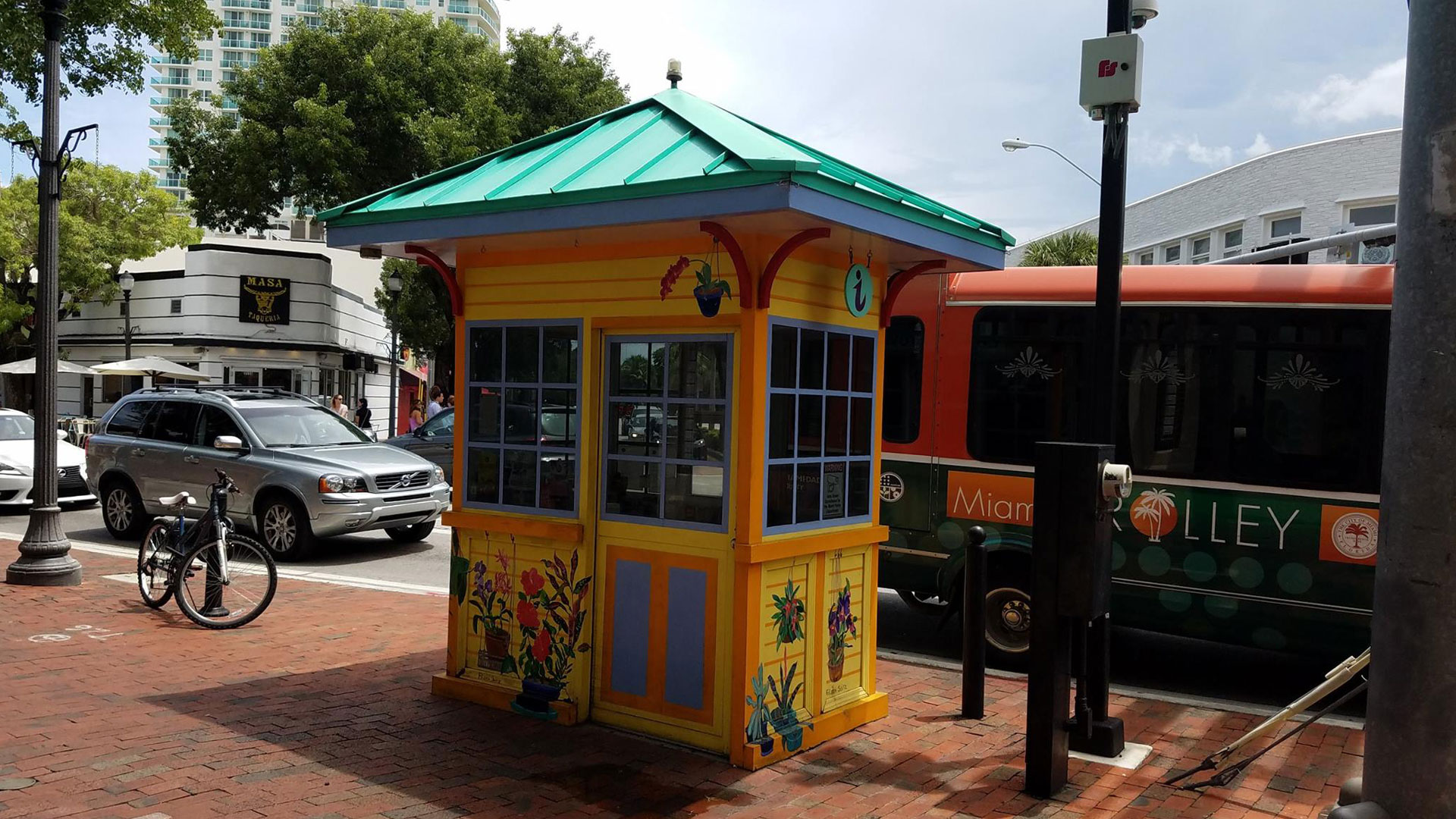 The prefabricated information booth, also known as prefab ticket booth or kiosk is extremely durable and long lasting with minimal maintenance, because it's made out of white aluminum. This information booth is almost 10 years old and still looks great. This ticket booth is located right in the heart of downtown Coconut Grove, Florida which is located in Miami-Dade County. The Mardan prefab booth can be customized to meet any desired design requirements and meet high velocity hurricane zone requirements in Florida.
